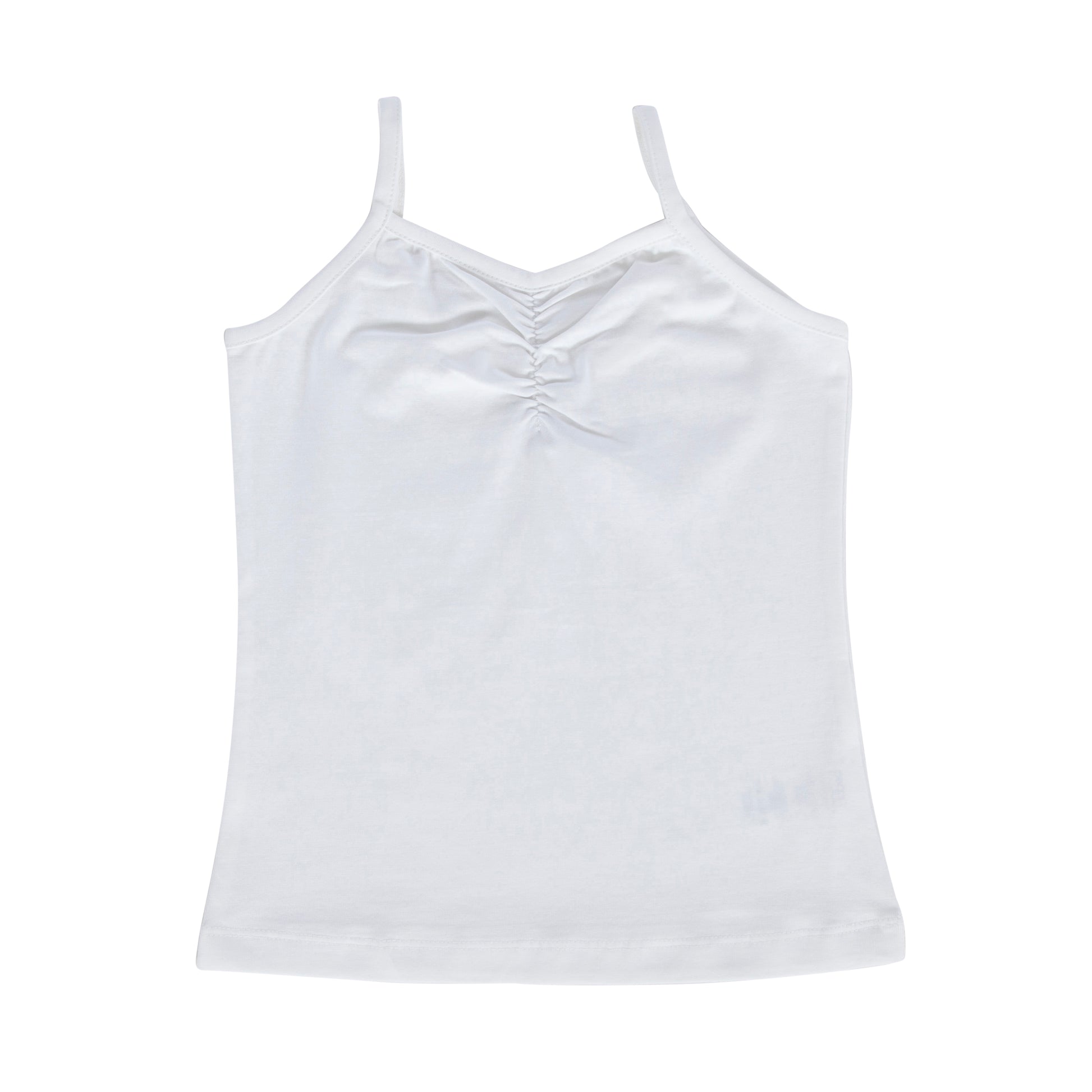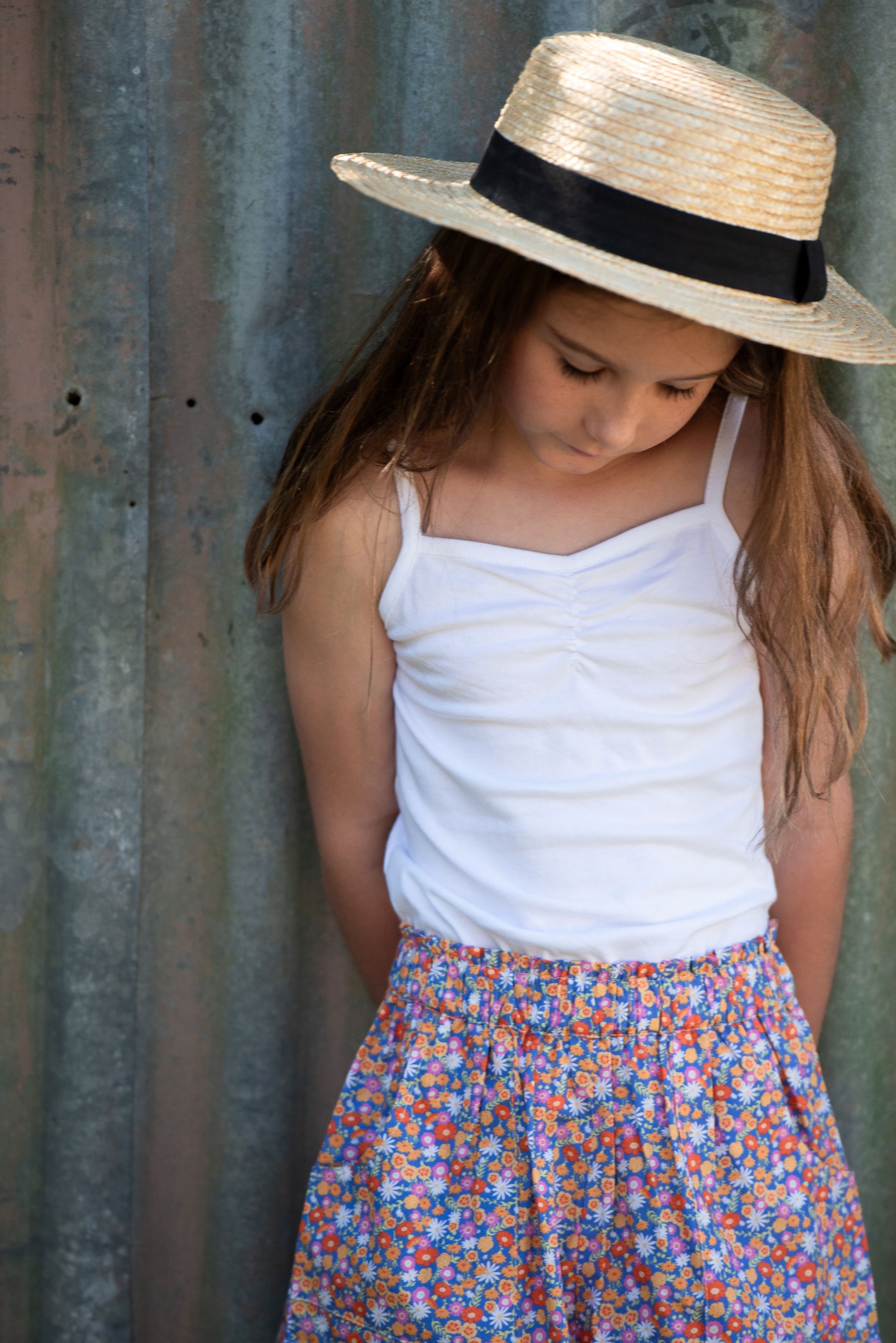 Thin strap cotton top. Ruched at the base of the neckline. Basic top to wear with anything in our gorgeous quality stretch 95% cotton 5% spandex.